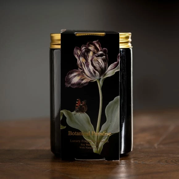 A sophisticated and elegant scent bursting with a floral white bouquet, peony and tea leaves wrapped around notes of patchouli, sleek woods and soft musk. The Botanical Paradise Candle lasts up to 65 hours and comes in an eye-catching black candle jar with screw top gold metal lid. Keep and re-use this glass vessel once the wax has melted.